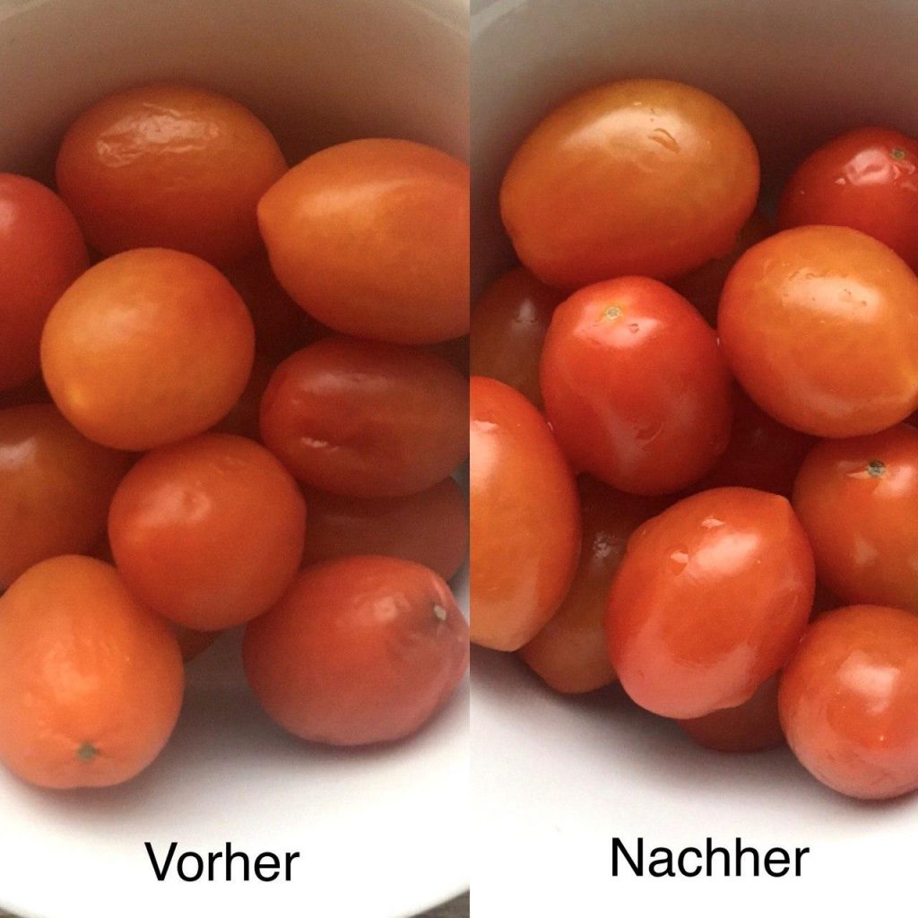 Links alte etwas verschrumpelte Cherrytomaten. Diese wurden für ca. 30 min in reines zellgängiges Wasser gelegt. Das Wasser konnte direkt in die Zellen vordringen und diese wieder hydratisieren. Die Tomaten sind nun wieder knackig und prall.